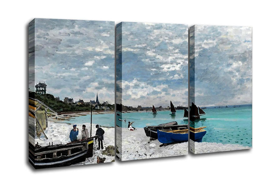 Monet The Beach At Sainte-Adresse 3 Panel Canvas Print handmade in the UK. Stretched over a 2 inch thick wooden box frame, ready to hang on your wall.