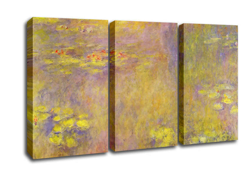 Monet Water Lilies - Yellow Nirvana 3 Panel Canvas Print handmade in the UK. Stretched over a 2 inch thick wooden box frame, ready to hang on your wall.