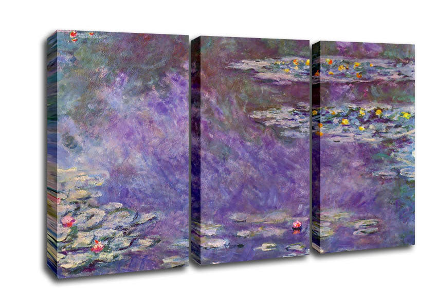 Monet Water Lily Pond 3 3 Panel Canvas Print handmade in the UK. Stretched over a 2 inch thick wooden box frame, ready to hang on your wall.