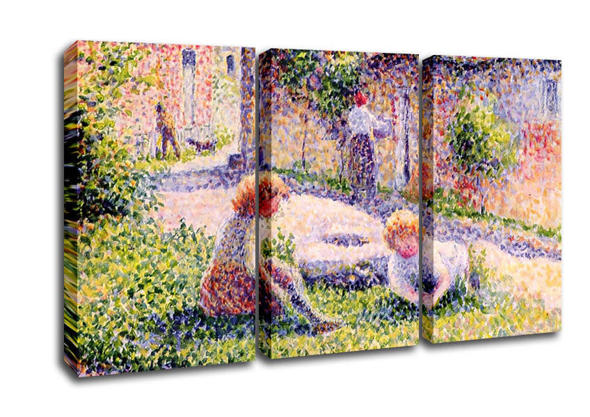 Pissarro Children On A Farm 3 Panel Canvas Print handmade in the UK. Stretched over a 2 inch thick wooden box frame, ready to hang on your wall.