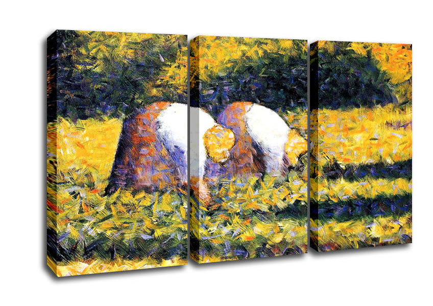 Seurat Farmers At Work 3 Panel Canvas Print handmade in the UK. Stretched over a 2 inch thick wooden box frame, ready to hang on your wall.