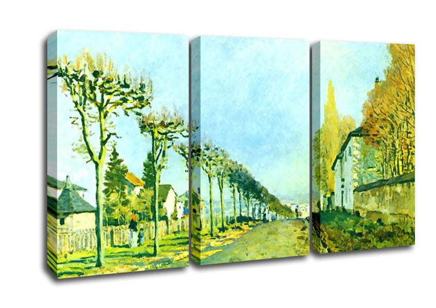 Sisley Street In Louveciennes 3 Panel Canvas Print handmade in the UK. Stretched over a 2 inch thick wooden box frame, ready to hang on your wall.