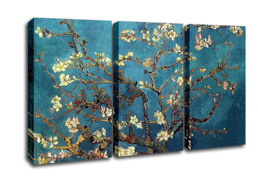 Van Gogh Almond Branches 3 Panel Canvas Print handmade in the UK. Stretched over a 2 inch thick wooden box frame, ready to hang on your wall.