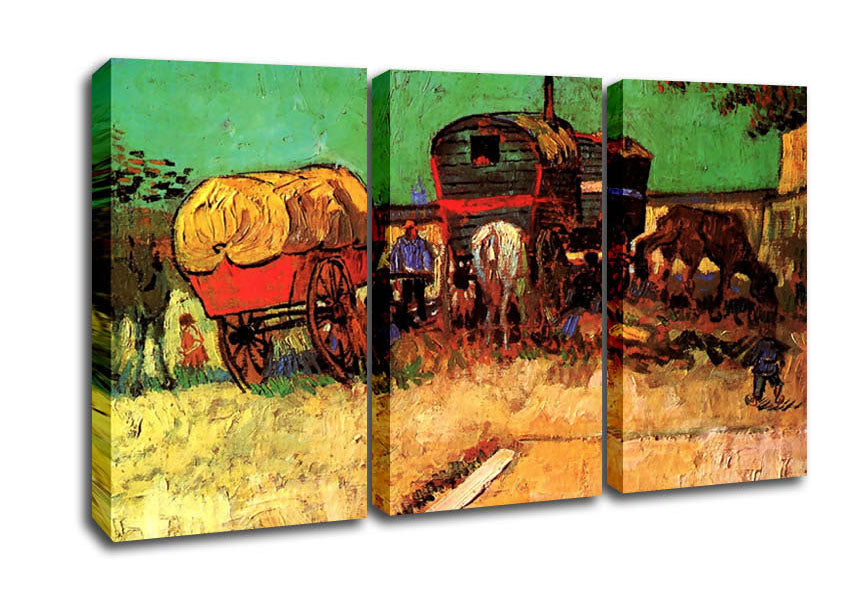Van Gogh Encampment Of Gypsies With Caravans 3 Panel Canvas Print handmade in the UK. Stretched over a 2 inch thick wooden box frame, ready to hang on your wall.