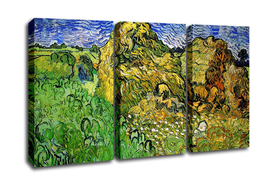 Van Gogh Field With Wheat Stacks 3 Panel Canvas Print handmade in the UK. Stretched over a 2 inch thick wooden box frame, ready to hang on your wall.