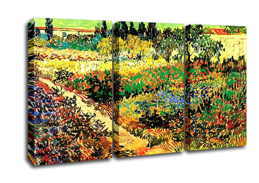 Van Gogh Flowering Garden With Path 3 Panel Canvas Print handmade in the UK. Stretched over a 2 inch thick wooden box frame, ready to hang on your wall.