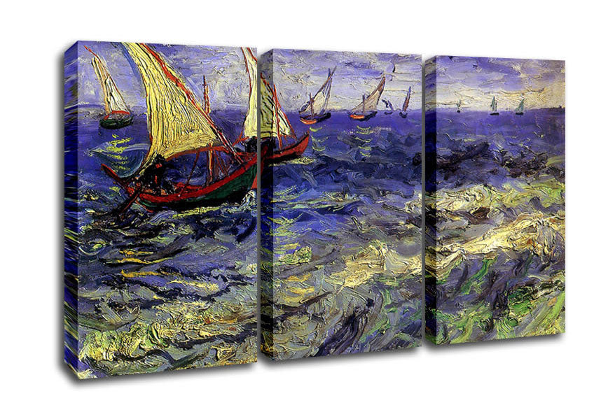 Van Gogh Ship n Boats 3 Panel Canvas Print handmade in the UK. Stretched over a 2 inch thick wooden box frame, ready to hang on your wall.