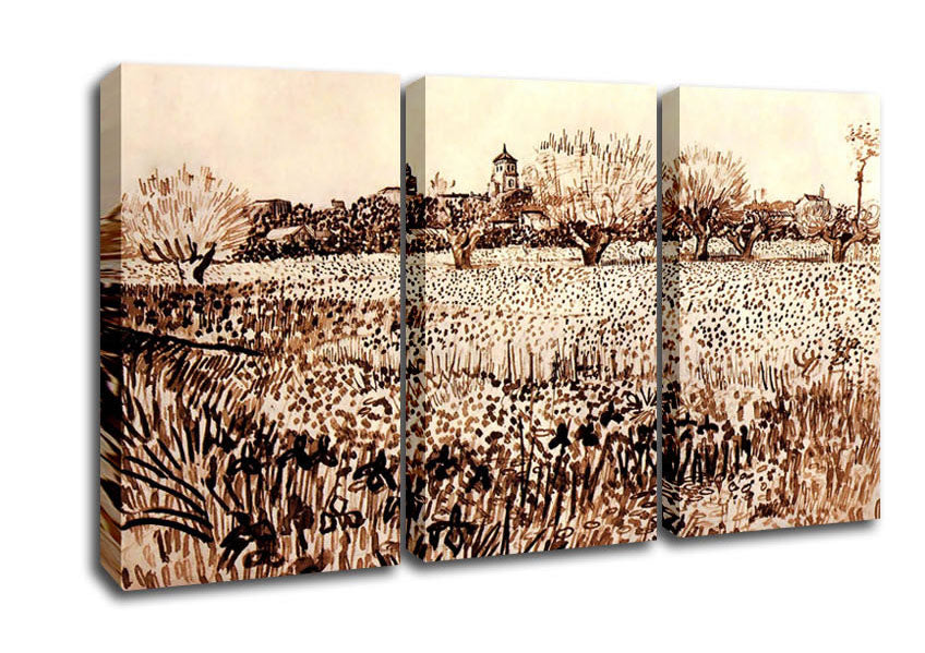 Vincent Van Gogh View Of Arles 3 Panel Canvas Print handmade in the UK. Stretched over a 2 inch thick wooden box frame, ready to hang on your wall.