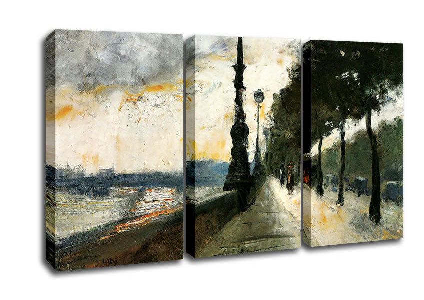 Waterloo Bridge In The Sun By Lesser Ury 3 Panel Canvas Print handmade in the UK. Stretched over a 2 inch thick wooden box frame, ready to hang on your wall.