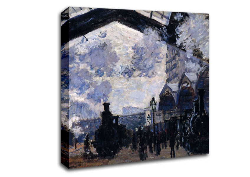 Monet The Gare St Lazare Square Canvas Print handmade in the UK. Stretched over a 2 inch thick wooden box frame, ready to hang on your wall.