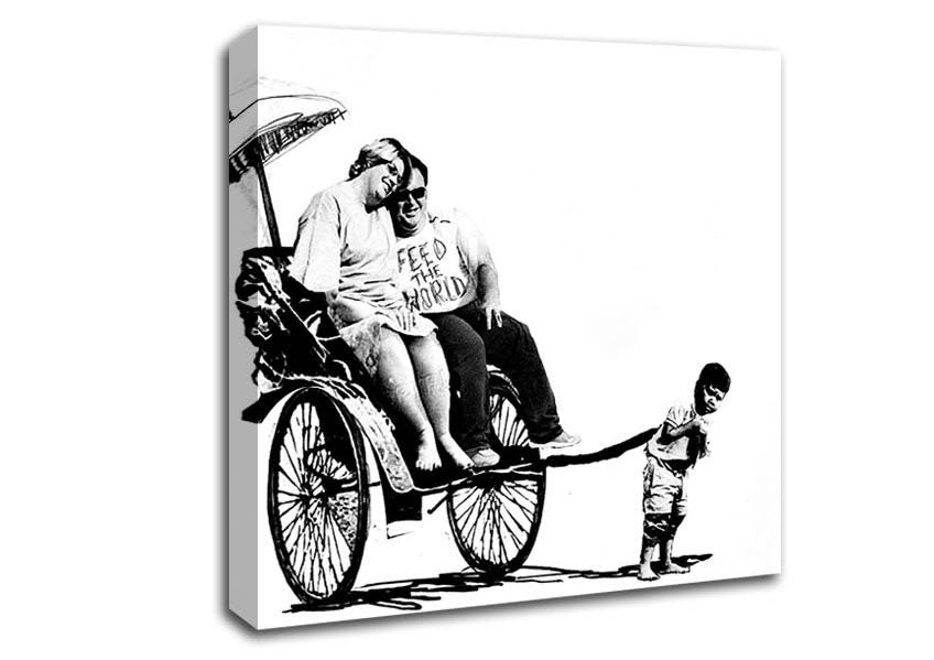 Feed The World B n W Square Canvas Print handmade in the UK. Stretched over a 2 inch thick wooden box frame, ready to hang on your wall.