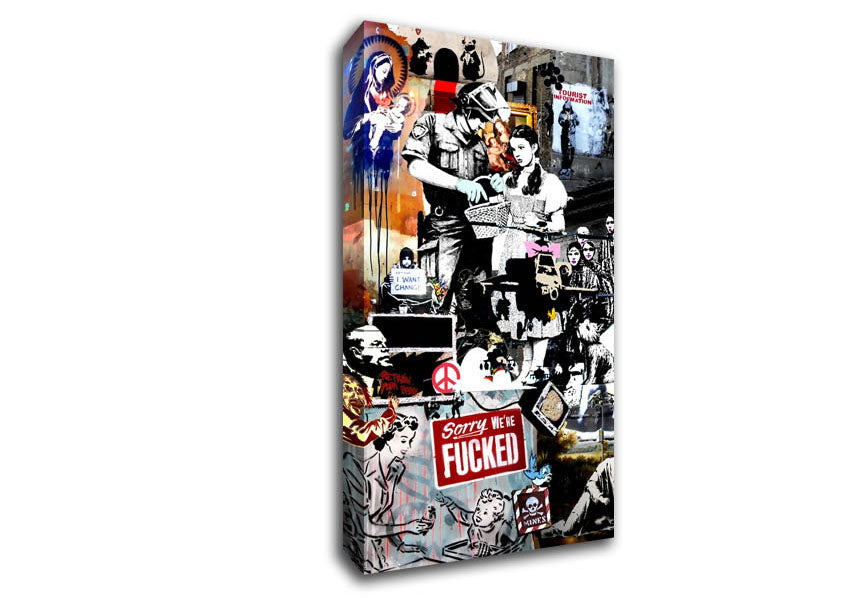 Banksy Collage 2 Wide Canvas Print handmade in the UK. Stretched over a 2 inch thick wooden box frame, ready to hang on your wall.