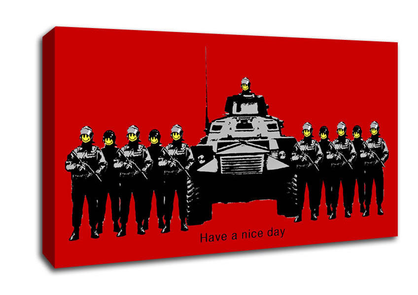 Have A Nice Day Army Tanks Red Wide Canvas Print handmade in the UK. Stretched over a 2 inch thick wooden box frame, ready to hang on your wall.