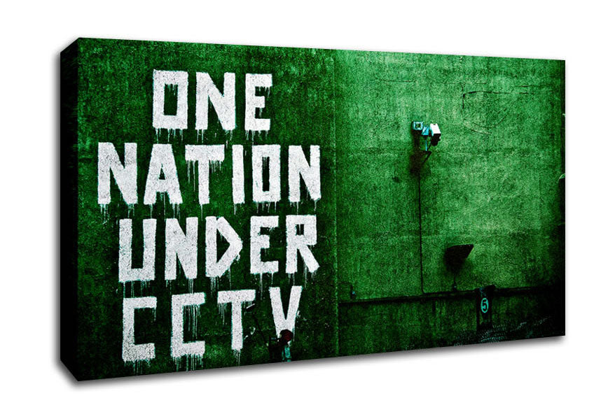 One Nation Under Cctv Green Wide Canvas Print handmade in the UK. Stretched over a 2 inch thick wooden box frame, ready to hang on your wall.