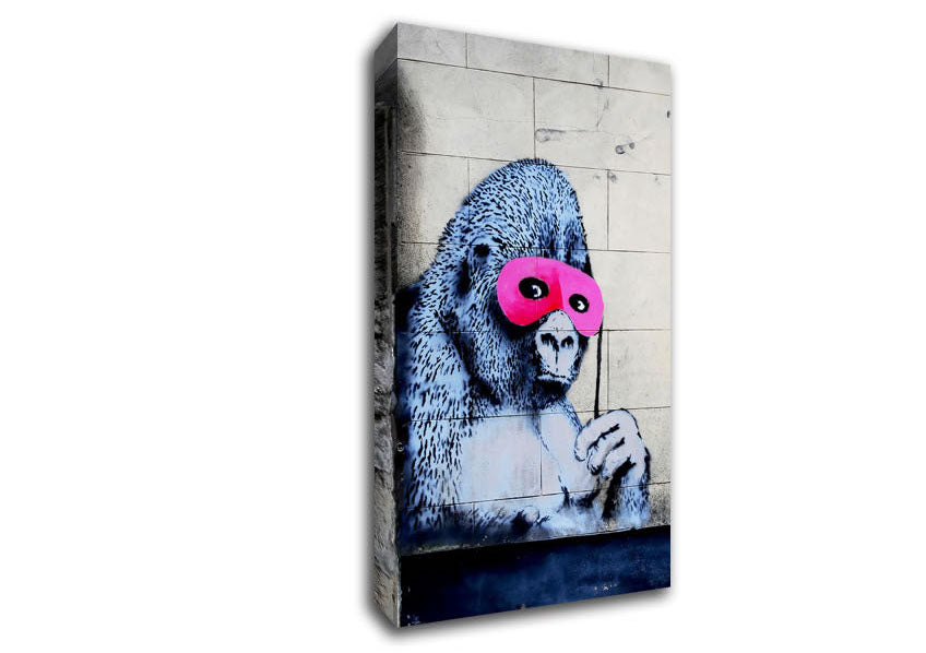 Pink Gorilla Mask Wide Canvas Print handmade in the UK. Stretched over a 2 inch thick wooden box frame, ready to hang on your wall.