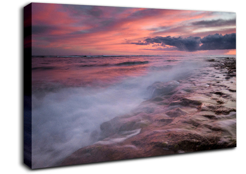 Perfect Pink Ocean Dusk Canvas Print handmade in the UK. Stretched over a 2 inch thick wooden box frame, ready to hang on your wall.