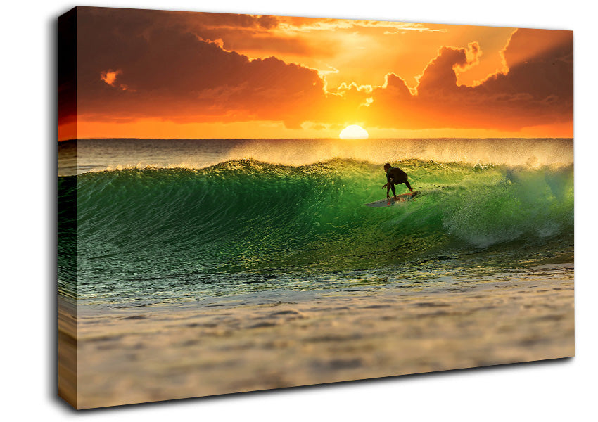 Surfer Sunset Canvas Print handmade in the UK. Stretched over a 2 inch thick wooden box frame, ready to hang on your wall.