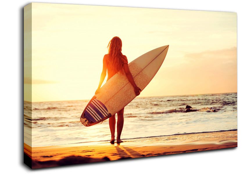 Surfers Sunrise Canvas Print handmade in the UK. Stretched over a 2 inch thick wooden box frame, ready to hang on your wall.