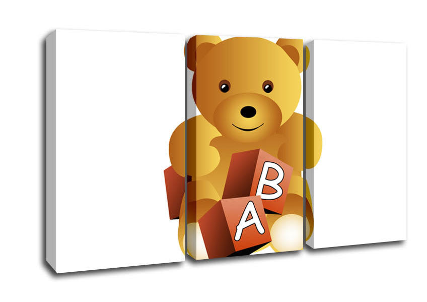 Teddy Bear Alphabet Blocks White 3 Panel Canvas Print handmade in the UK. Stretched over a 2 inch thick wooden box frame, ready to hang on your wall.