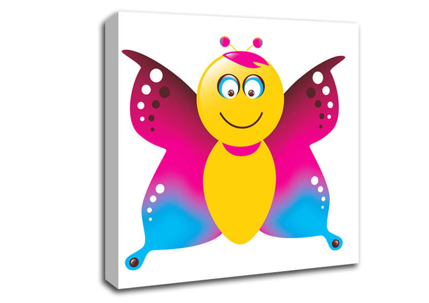Butterfly Cartoon Face White Square Canvas Print handmade in the UK. Stretched over a 2 inch thick wooden box frame, ready to hang on your wall.