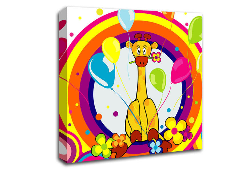 Giraffe Balloon Circles White Square Canvas Print handmade in the UK. Stretched over a 2 inch thick wooden box frame, ready to hang on your wall.