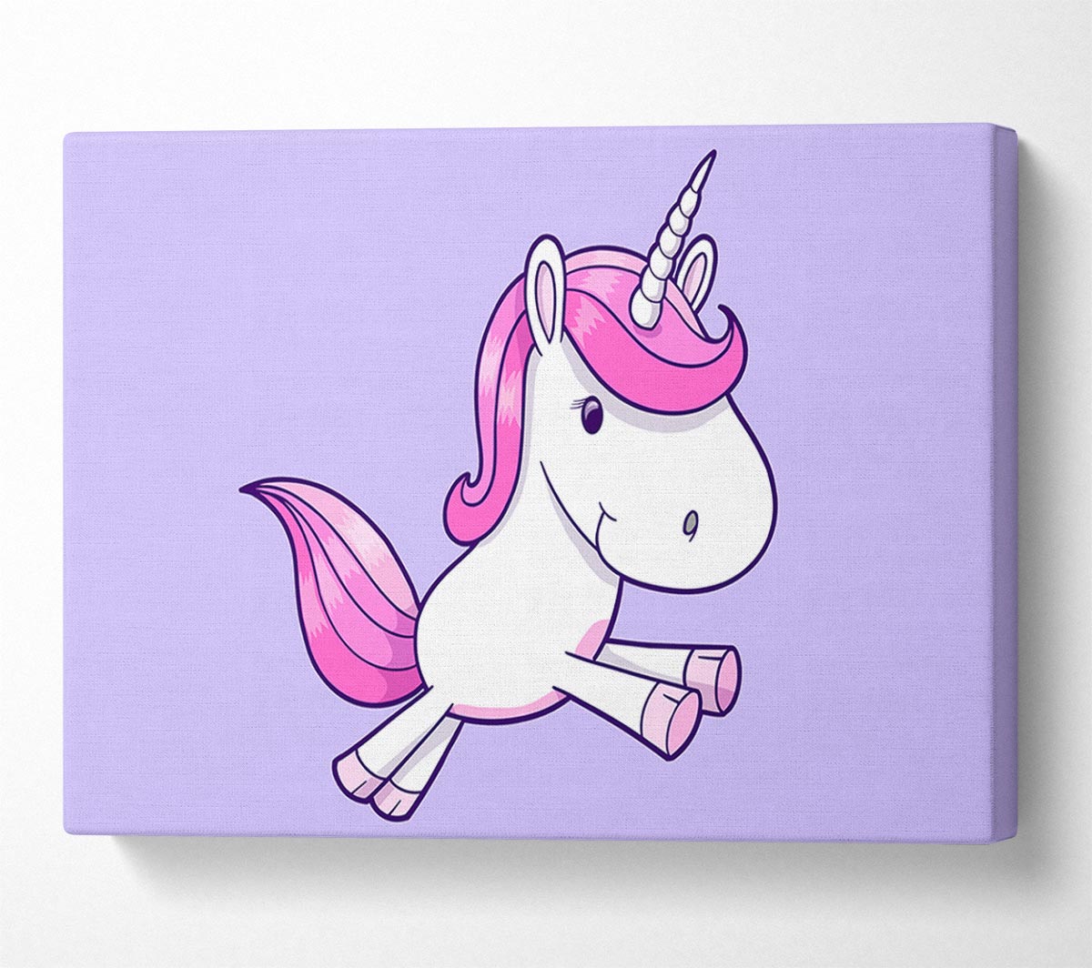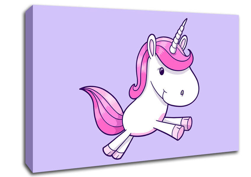 Leaping Unicorn Lilac Canvas Print handmade in the UK. Stretched over a 2 inch thick wooden box frame, ready to hang on your wall.