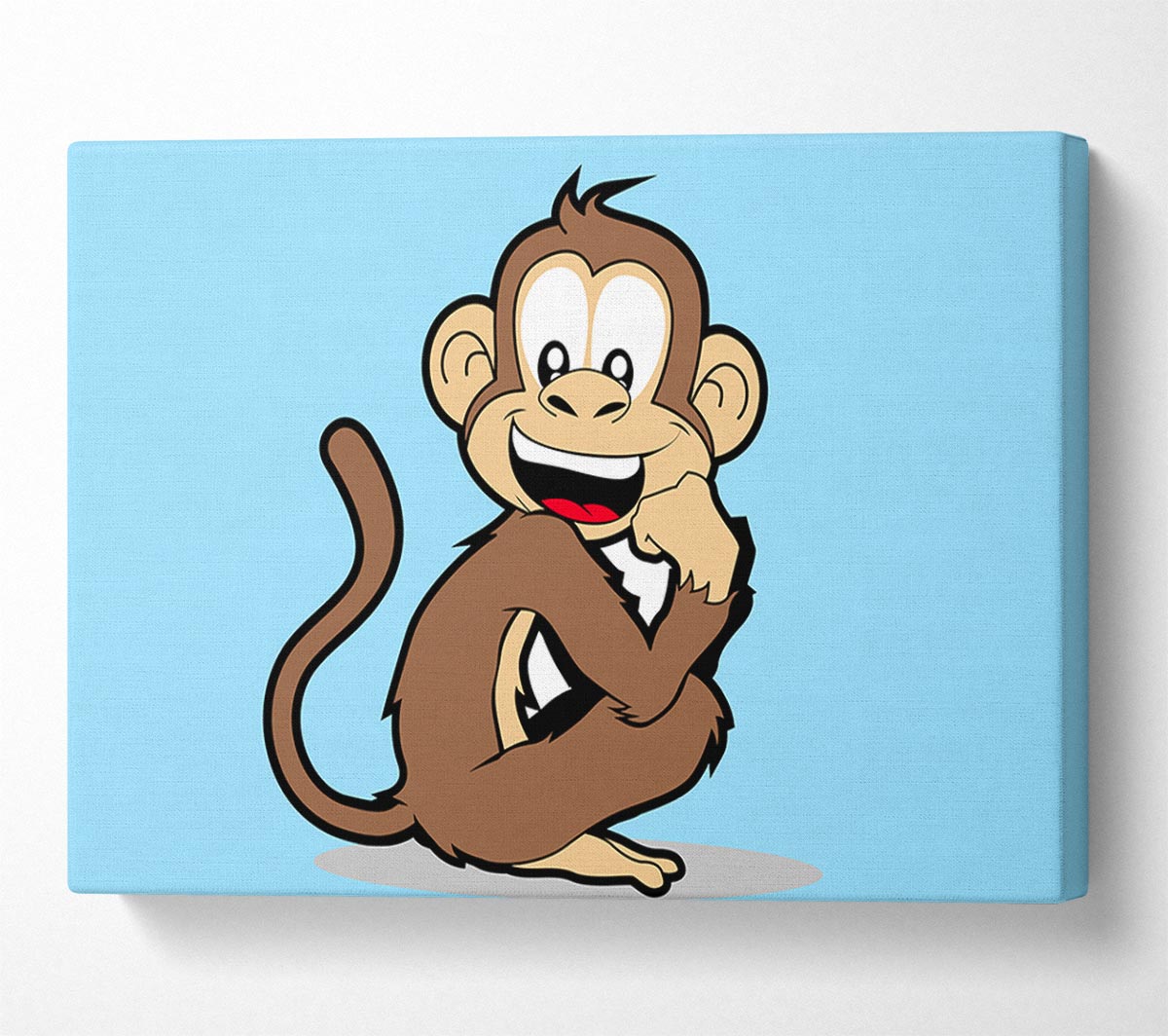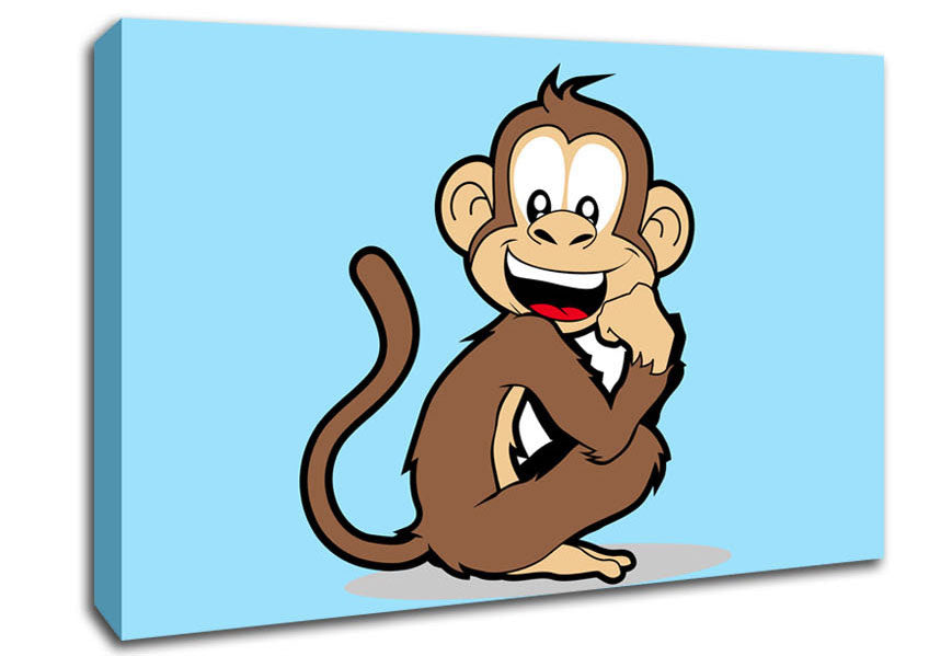 Sitting Monkey Smiling Baby Blue Canvas Print handmade in the UK. Stretched over a 2 inch thick wooden box frame, ready to hang on your wall.