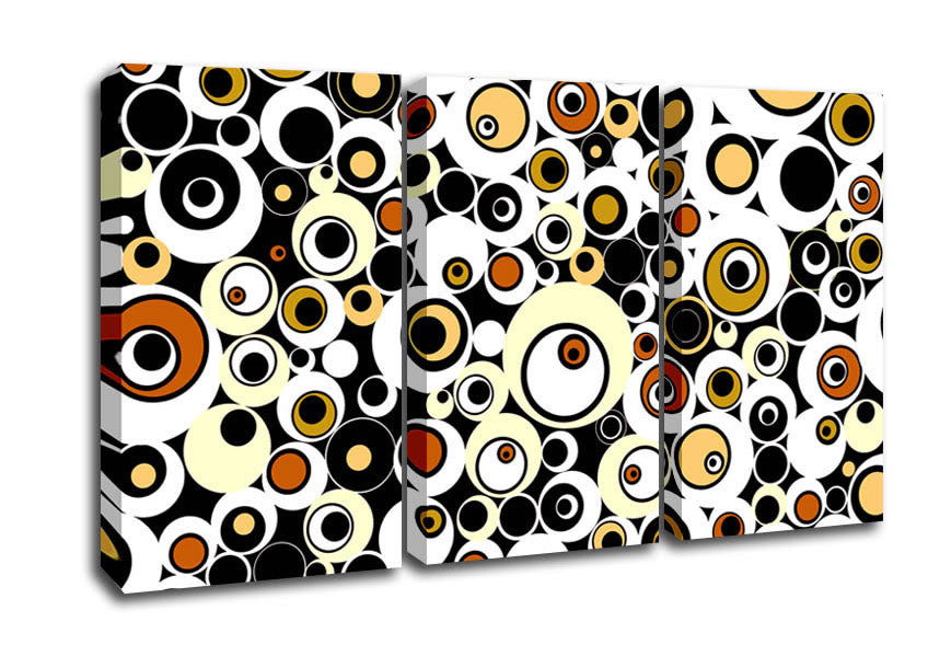 Circles And Bubbles 3 Panel Canvas Print handmade in the UK. Stretched over a 2 inch thick wooden box frame, ready to hang on your wall.