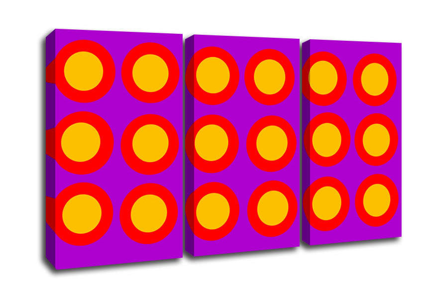 Circles Of Light Yellow On Purple 3 Panel Canvas Print handmade in the UK. Stretched over a 2 inch thick wooden box frame, ready to hang on your wall.