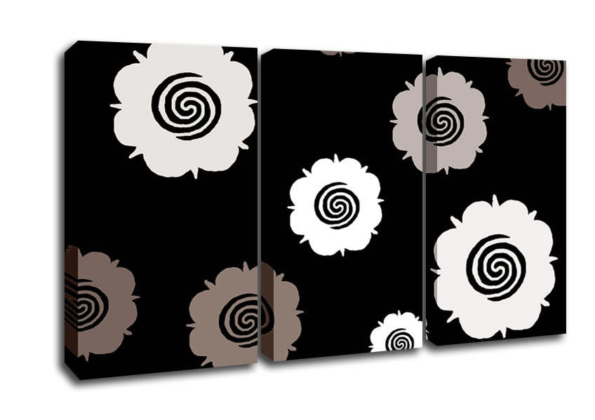 Flowers Beige On Black 3 Panel Canvas Print handmade in the UK. Stretched over a 2 inch thick wooden box frame, ready to hang on your wall.
