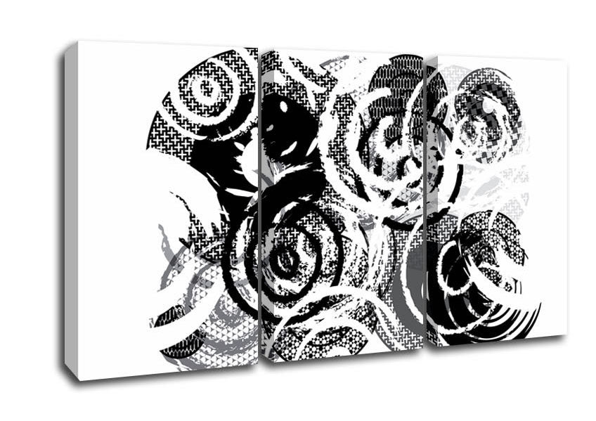 Swirls Of Circles B n W 3 Panel Canvas Print handmade in the UK. Stretched over a 2 inch thick wooden box frame, ready to hang on your wall.