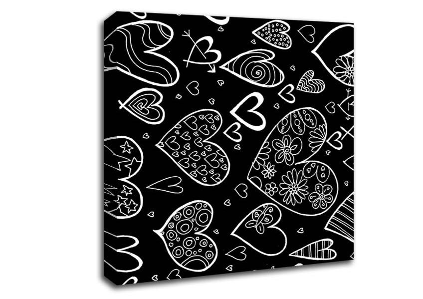 Hearts White On Black Square Canvas Print handmade in the UK. Stretched over a 2 inch thick wooden box frame, ready to hang on your wall.