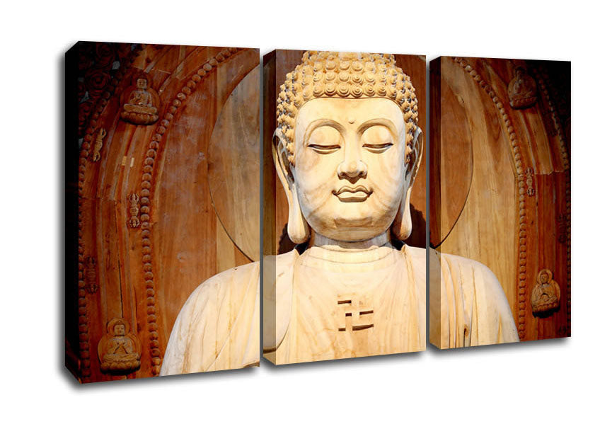 Buddha Face Statue 3 Panel Canvas Print handmade in the UK. Stretched over a 2 inch thick wooden box frame, ready to hang on your wall.