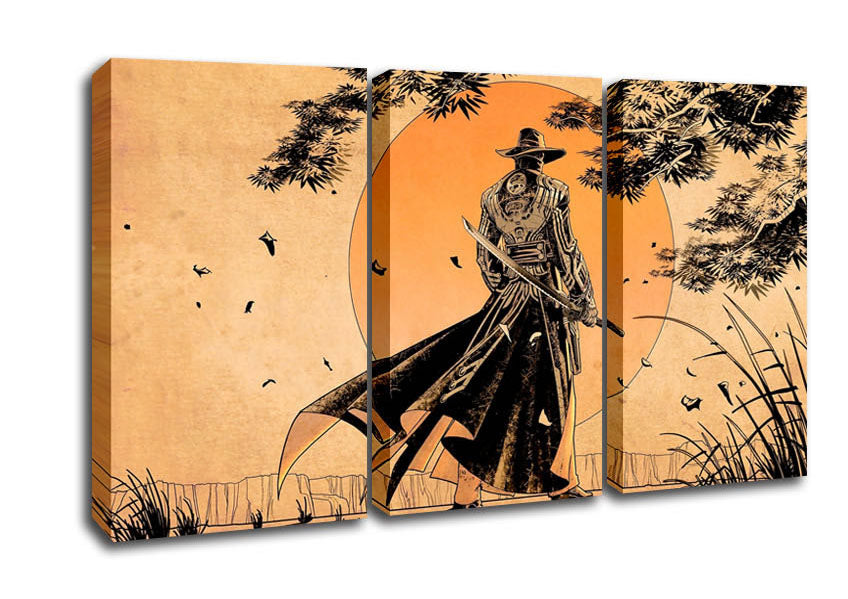 Japanese Samurai Sunset 3 Panel Canvas Print handmade in the UK. Stretched over a 2 inch thick wooden box frame, ready to hang on your wall.