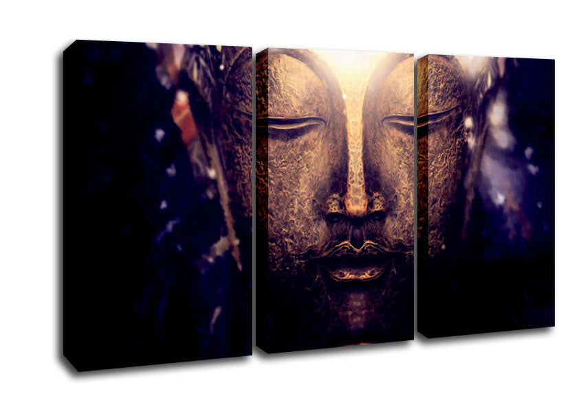 Light From The Buddha Face 3 Panel Canvas Print handmade in the UK. Stretched over a 2 inch thick wooden box frame, ready to hang on your wall.