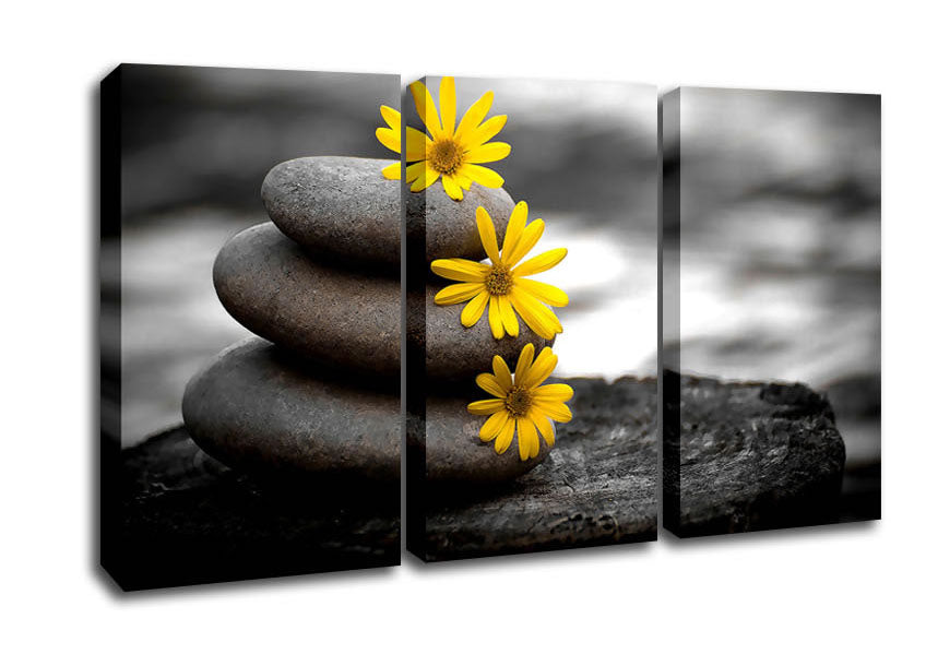 Zen Flowered Stones 3 Panel Canvas Print handmade in the UK. Stretched over a 2 inch thick wooden box frame, ready to hang on your wall.