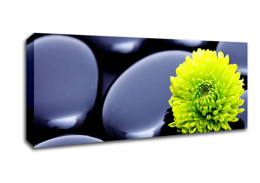 Black Zen Stones And A Yellow Mum Panoramic Canvas Print handmade in the UK. Stretched over a 2 inch thick wooden box frame, ready to hang on your wall.