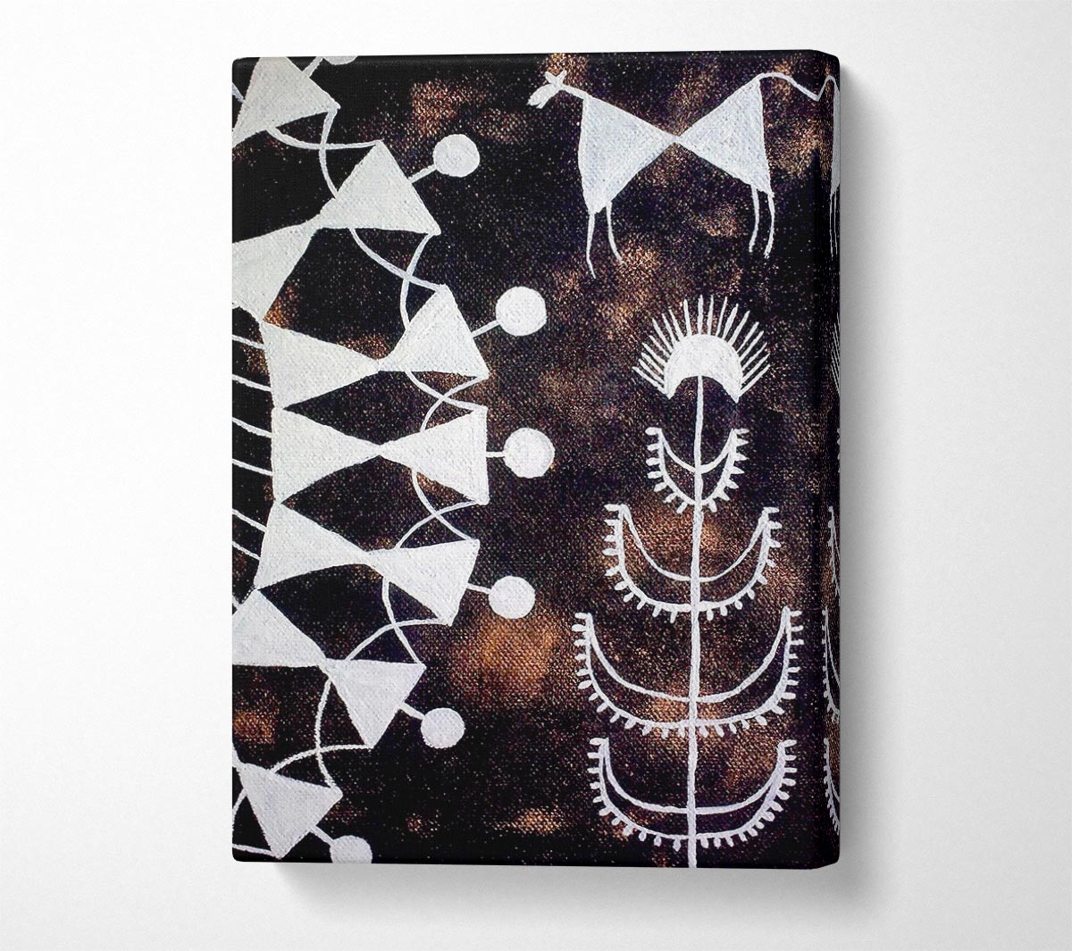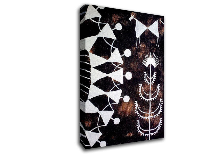 Aboriginal Warli Tarpa Dance Canvas Print handmade in the UK. Stretched over a 2 inch thick wooden box frame, ready to hang on your wall.