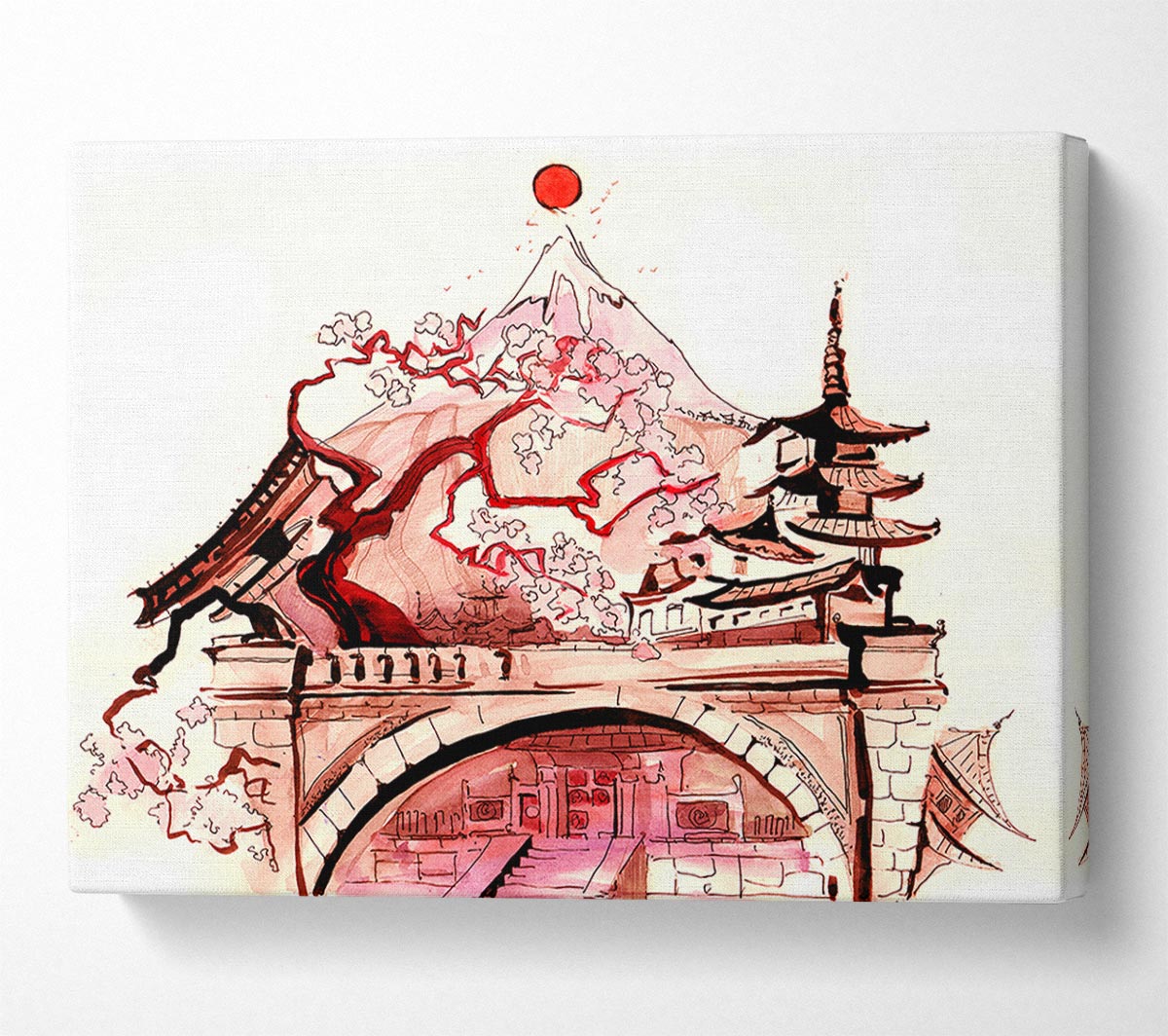 Chinese Cherry Blossom Temple Canvas Print handmade in the UK. Stretched over a 2 inch thick wooden box frame, ready to hang on your wall.