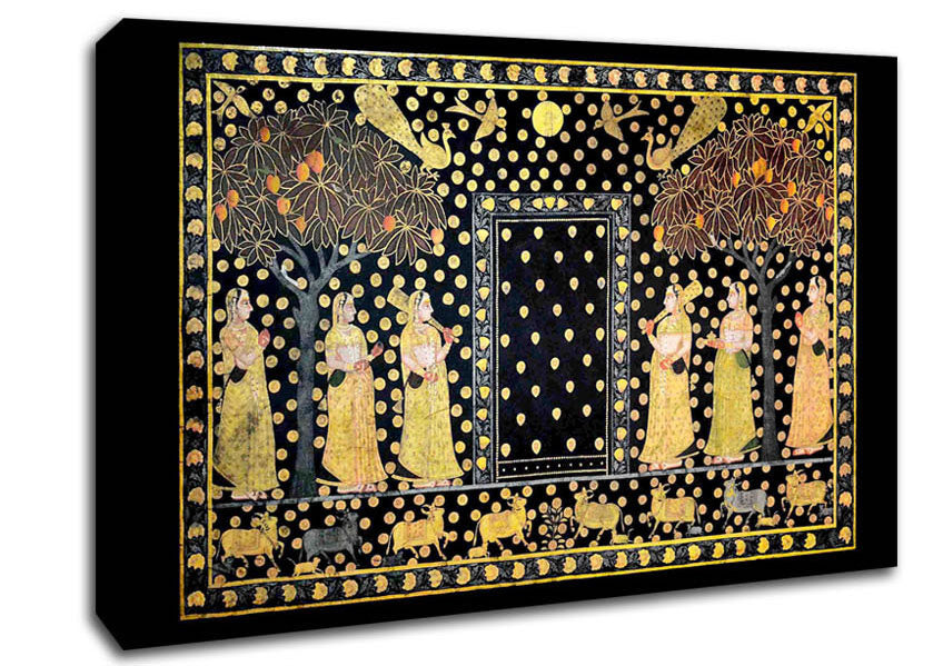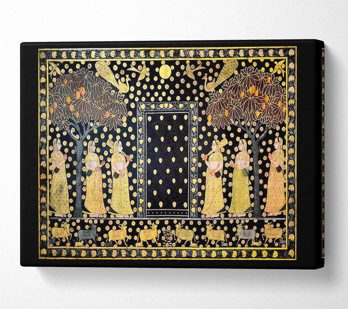 Hindu Pichwai Painting Rajasthan Canvas Print handmade in the UK. Stretched over a 2 inch thick wooden box frame, ready to hang on your wall.