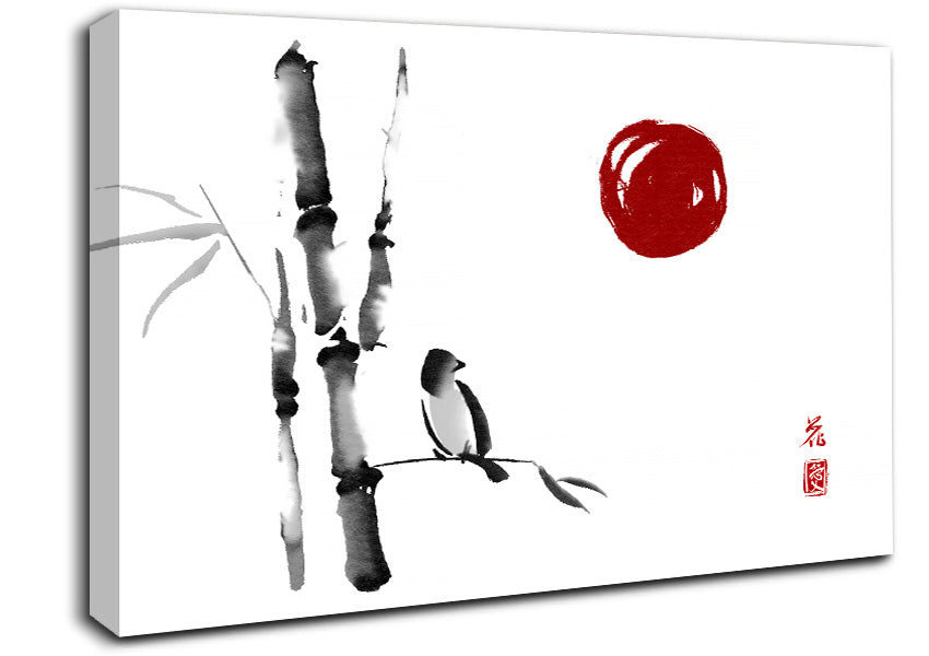 Japanese Bamboo Bird In The Red Sun Canvas Print handmade in the UK. Stretched over a 2 inch thick wooden box frame, ready to hang on your wall.