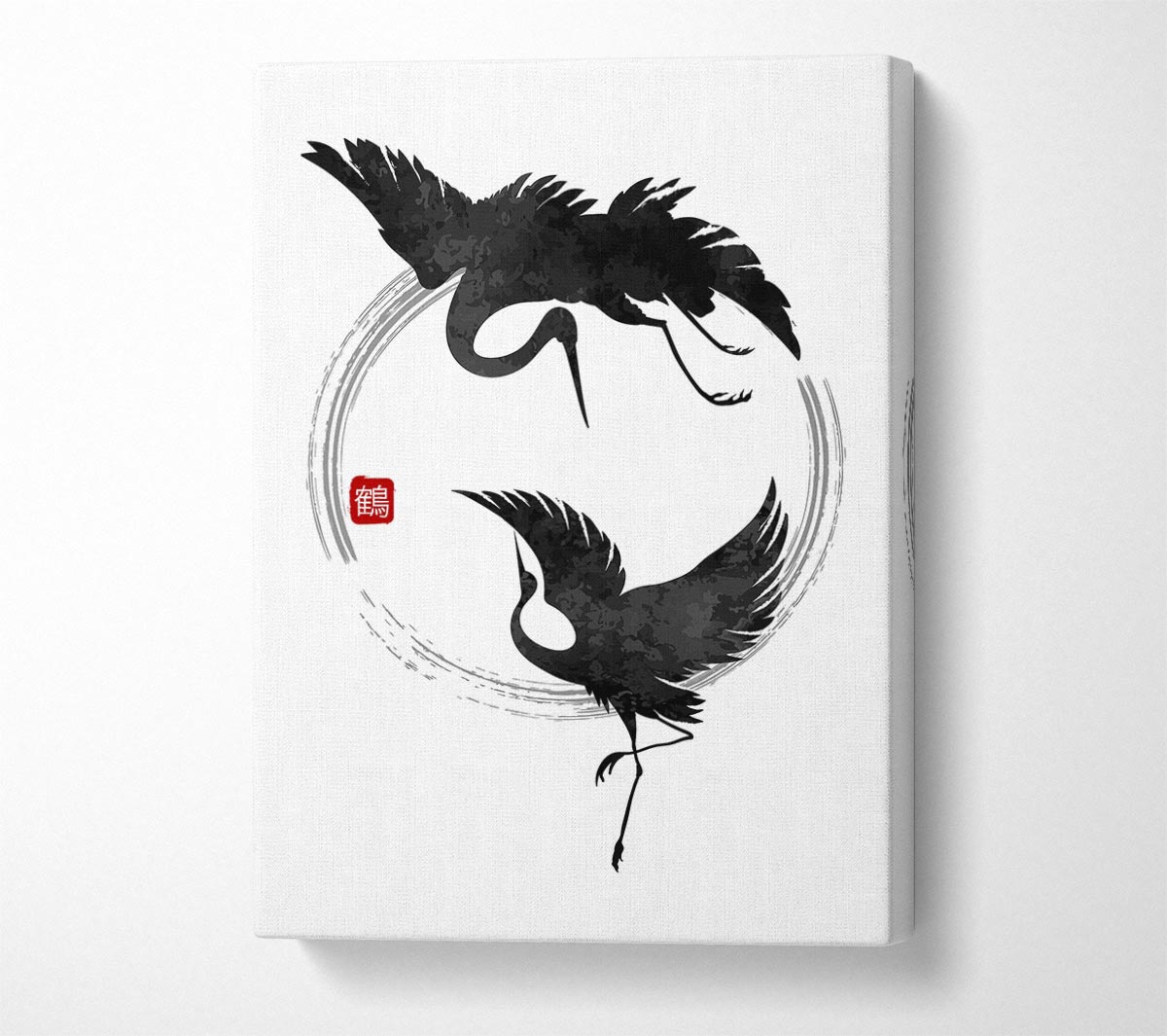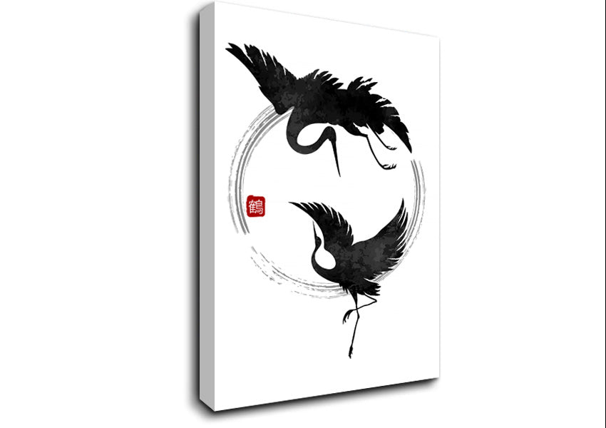 Japanese Cranes In The Circle Of Life Canvas Print handmade in the UK. Stretched over a 2 inch thick wooden box frame, ready to hang on your wall.