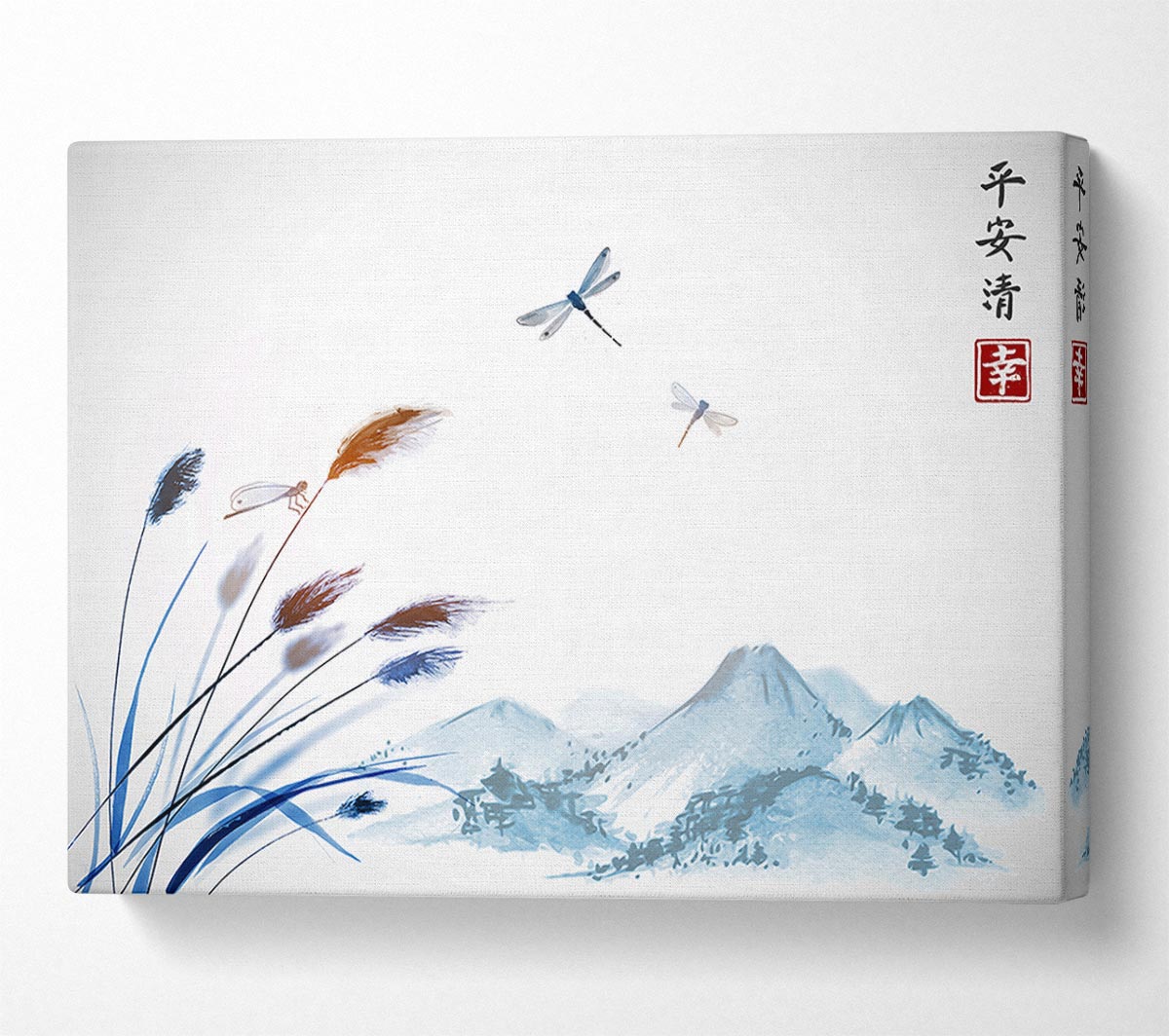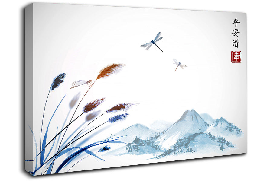 Japanese Dragonfly Canvas Print handmade in the UK. Stretched over a 2 inch thick wooden box frame, ready to hang on your wall.