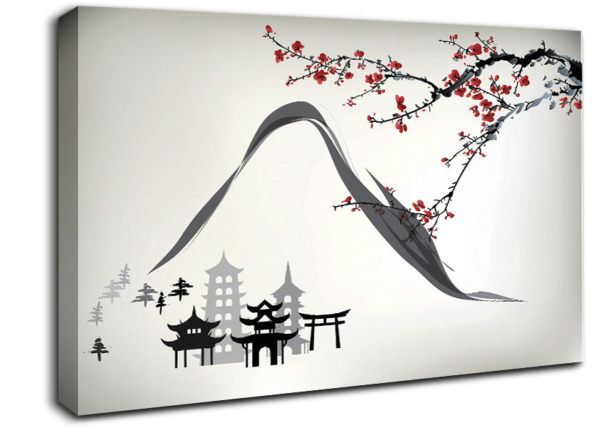 Mountains And Chinese Cherry Blossom Canvas Print handmade in the UK. Stretched over a 2 inch thick wooden box frame, ready to hang on your wall.
