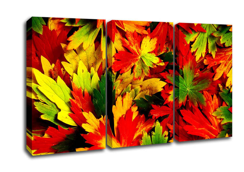 Autumn Leaves Of Colour 3 Panel Canvas Print handmade in the UK. Stretched over a 2 inch thick wooden box frame, ready to hang on your wall.