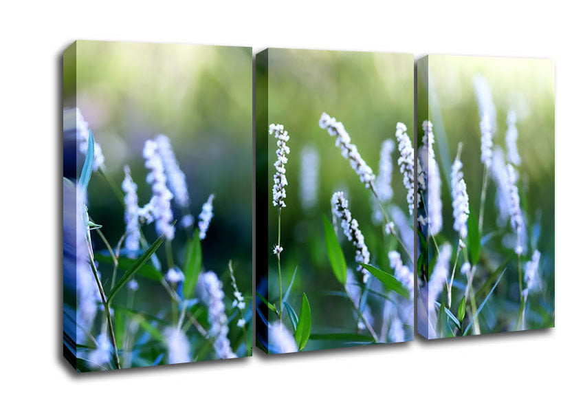 Blue Field Flowers 3 Panel Canvas Print handmade in the UK. Stretched over a 2 inch thick wooden box frame, ready to hang on your wall.