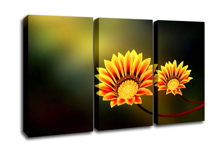 Duo Fire Flowers 3 Panel Canvas Print handmade in the UK. Stretched over a 2 inch thick wooden box frame, ready to hang on your wall.