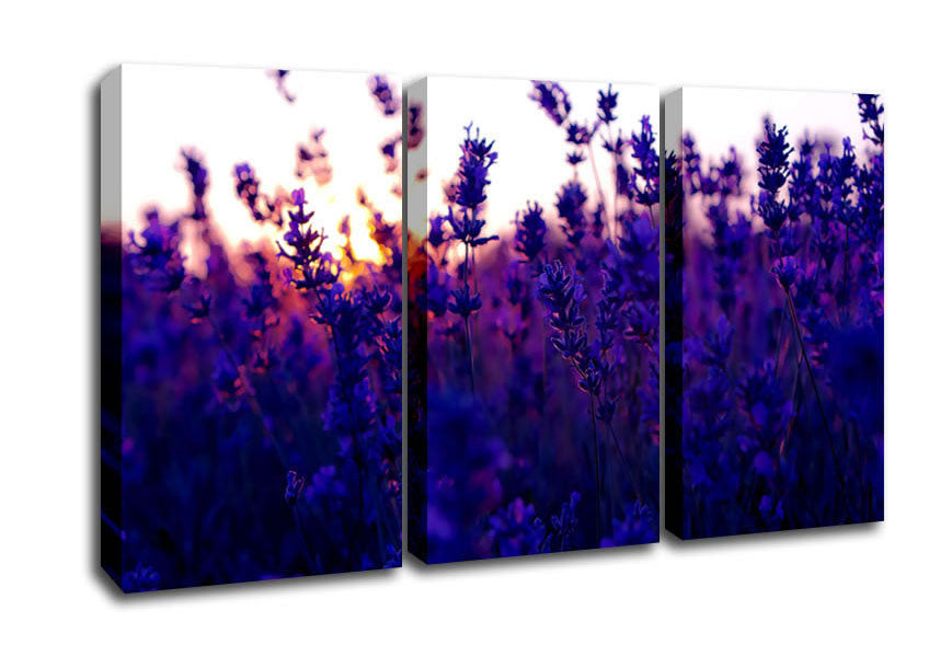 Lavender Field And Sunset 3 Panel Canvas Print handmade in the UK. Stretched over a 2 inch thick wooden box frame, ready to hang on your wall.