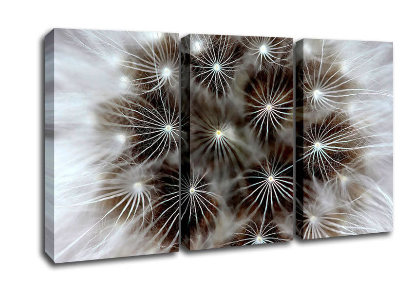 Macro Dandelion 3 Panel Canvas Print handmade in the UK. Stretched over a 2 inch thick wooden box frame, ready to hang on your wall.