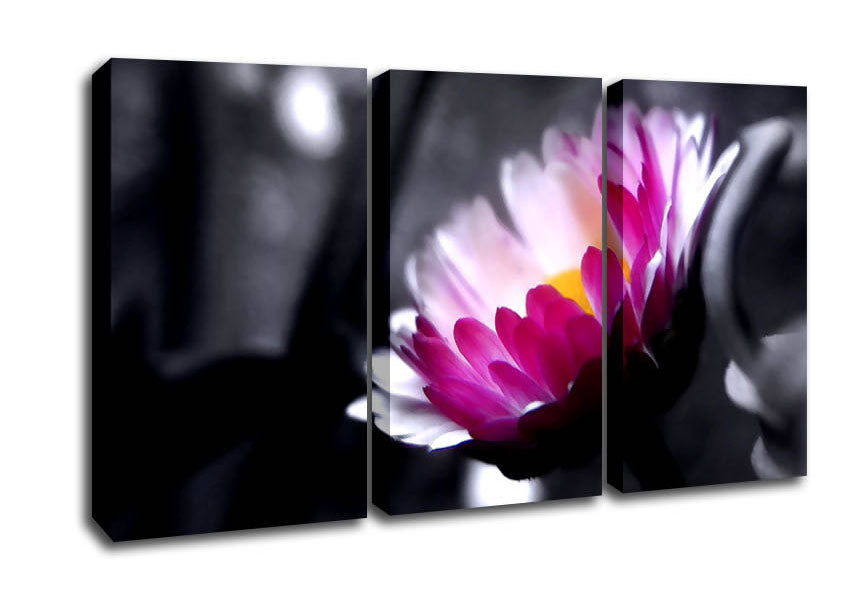 Pink Flower On Black And White Background 3 Panel Canvas Print handmade in the UK. Stretched over a 2 inch thick wooden box frame, ready to hang on your wall.